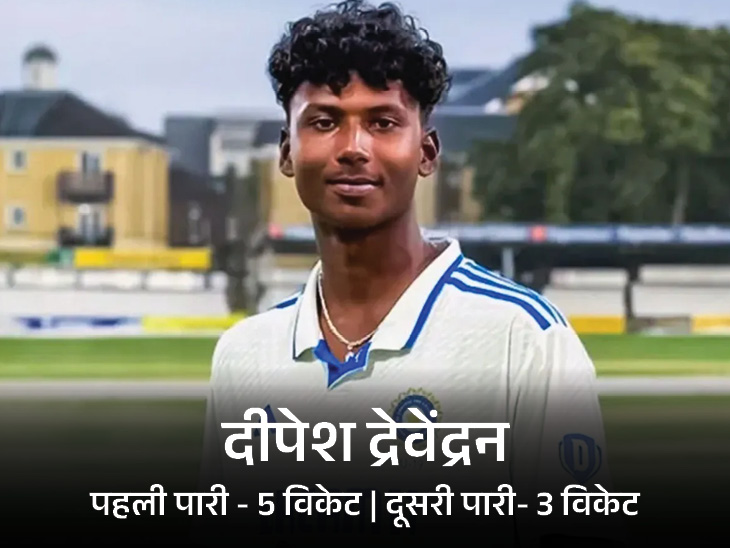 भारत की जीत के हीरो दीपेश द्रेवेंद्रन, वैभव सूर्यवंशी और वेदांत त्रिवेदी रहे। दीपेश ने मैच में कुल 8 विकेट लिए। पहली पारी में 5 और दूसरी पारी में 3। वहीं वैभव और वेदांत ने पहली पारी में शतक जमाया।