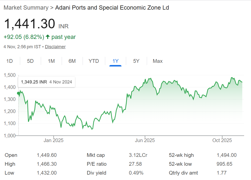 दूसरी तिमाही के नतीजों के बाद अडाणी पोर्ट के शेयर में मामूली गिरावट है, ये 0.37% नीचे1,439.40 पर कारोबार कर रहा है। बीते एक महीने में कंपनी का शेयर 2.78%, 6 महीने में यह 6.85% और एक साल में 6.68% का रिटर्न दिया है। कंपनी का मार्केट कैप 3.12 लाख करोड़ रुपए है।