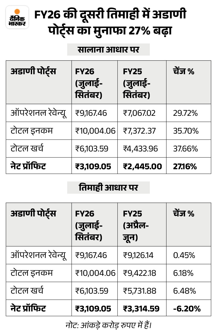 अडाणी ग्रुप की कंपनी अडाणी पोर्ट्स एंड स्पेशल इकोनॉमिक जोन (SEZ) को वित्त वर्ष 2025-26 की दूसरी तिमाही में 3,109.05 करोड़ रुपए का मुनाफा हुआ है। सालाना आधार पर यह 27.16% बढ़ा है। पिछले साल के इसी तिमाही में कंपनी को ₹2,445 करोड़ का मुनाफा हुआ था।