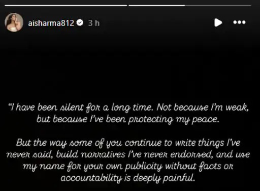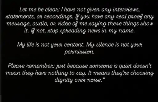मैं साफ कर दूं, मैंने कोई इंटरव्यू, बयान या रिकॉर्डिंग नहीं दी है। अगर आपके पास कोई असली सबूत है। कोई मैसेज, ऑडियो या वीडियो जिसमें मैं ये बातें कह रही हूं तो दिखाइए। अगर नहीं है, तो कृपया मेरे नाम पर झूठी बातें फैलाना बंद कीजिए। मेरा जीवन आपका कंटेंट नहीं है। मेरी चुप्पी आपकी इजाज़त नहीं है। कृपया याद रखें, कोई चुप है, इसका मतलब यह नहीं कि उसके पास कहने को कुछ नहीं है। इसका मतलब है कि वह शोर के बजाय सम्मान को चुन रहा है।