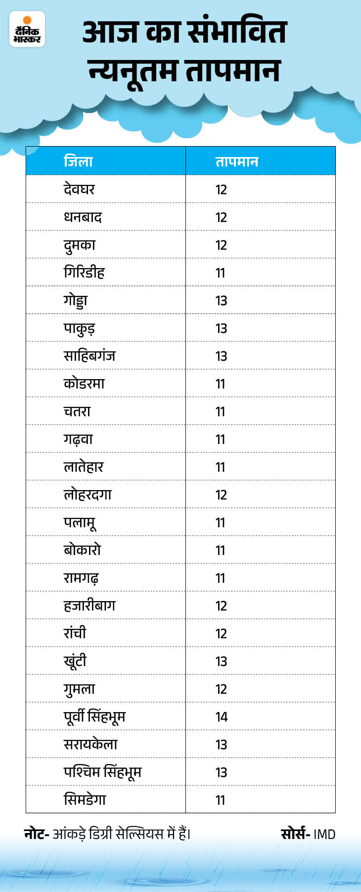 मौसम वैज्ञानिक अभिषेक आनंद के अनुसार आज से मौसम साफ हो जाने वाला है। ऐसे में बादल छंटने की वजह से न्यूनतम तापमान में 5-6 डिग्री तक की गिरावट देखने को मिलेगी। अहले सुबह और रात में कड़ाके की ठंड पड़ेगी। खासतौर पर नेतरहाट, गुमला, पाकुड़ व रांची के कांके जैसे इलाके में कड़ाके की ठंड शाम को रहेगी। शीतलहर भी चलेगी, जिसे लेकर थोड़ा सचेत रहने की जरूरत है।