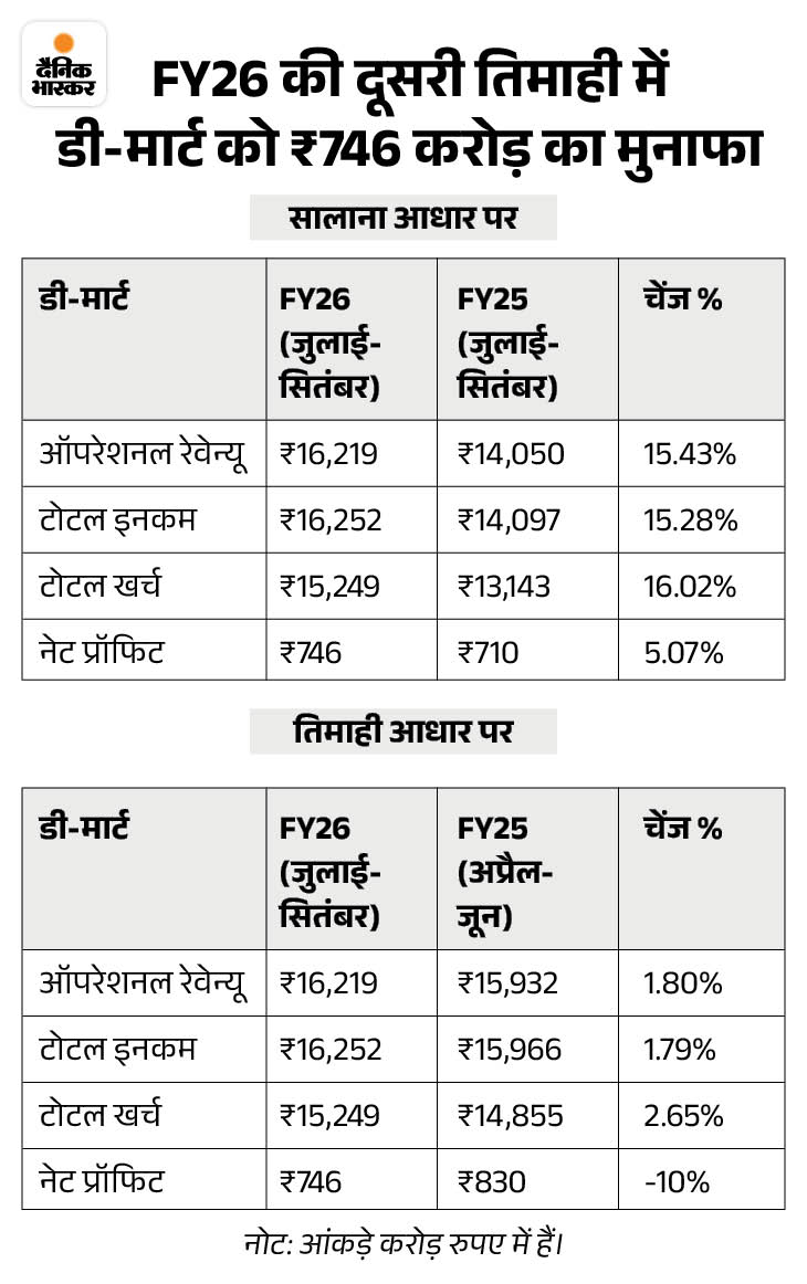 रिटेल चेन डी-मार्ट को ऑपरेट करने वाली कंपनी एवेन्यू सुपरमार्ट्स लिमिटेड को वित्त वर्ष 2025-26 की दूसरी तिमाही में 746 करोड़ रुपए का मुनाफा (स्टैंडअलोन नेट प्रॉफिट) हुआ है। सालाना आधार पर यह 5.07% बढ़ा है। पिछले साल की समान तिमाही में भी कंपनी को ₹710 करोड़ का ही मुनाफा हुआ था।