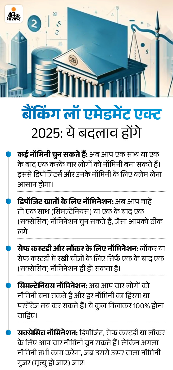 वित्त मंत्रालय ने बताया कि बैंक खातों में तो ग्राहक एक साथ चार नॉमिनी रजिस्टर कर सकते हैं, लेकिन सेफ कस्टडी और लॉकर के मामले में केवल सक्सेसिव नॉमिनी ही बनाए जा सकेंगे। इसका मतबल है कि पहले नंबर पर दर्ज नॉमिनी के न रहने पर दूसरे की दावेदारी होगी। इस बदलाव से लॉकर में रखे गहने, कागजात और मूल्यवान वस्तुओं के क्लेम में देरी नहीं होगी।