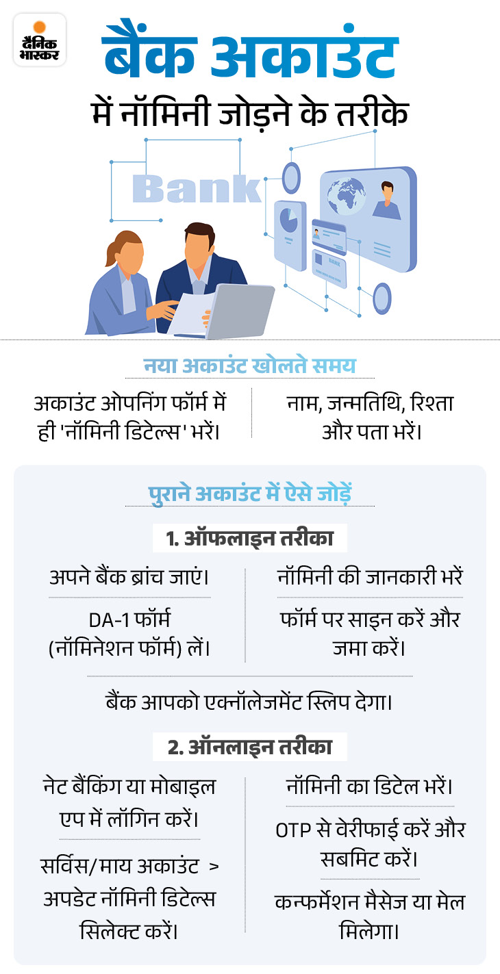 बैंक खाते में अब एक की जगह चार नॉमिनी जोड़े जा सकेंगे। ग्राहक यह भी तय कर पाएंगे कि चार नॉमिनी में से किसे कितना हिस्सा मिलेगा और किसे प्राथमिकता दी जाएगी।
