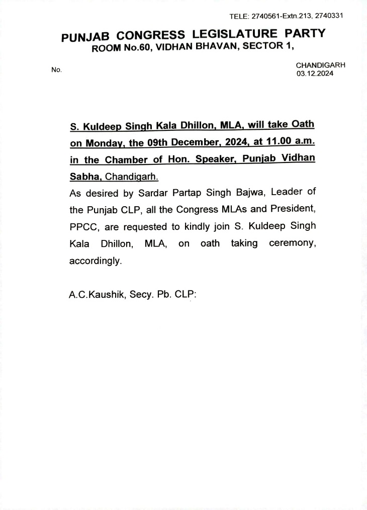 पंजाब में बरनाला सीट से विधानसभा उपचुनाव जीते कांग्रेस के विधायक कुलदीप सिंह काला ढिल्लों आज मंगलवार को शपथ लेंगे। शपथ समारोह 11 बजे पंजाब विधानसभा में संपन्न होगा। विधानसभा के स्पीकर कुलतार सिंह संधवां उन्हें शपथ दिलाएंगे। इस दौरान कांग्रेस के सारे