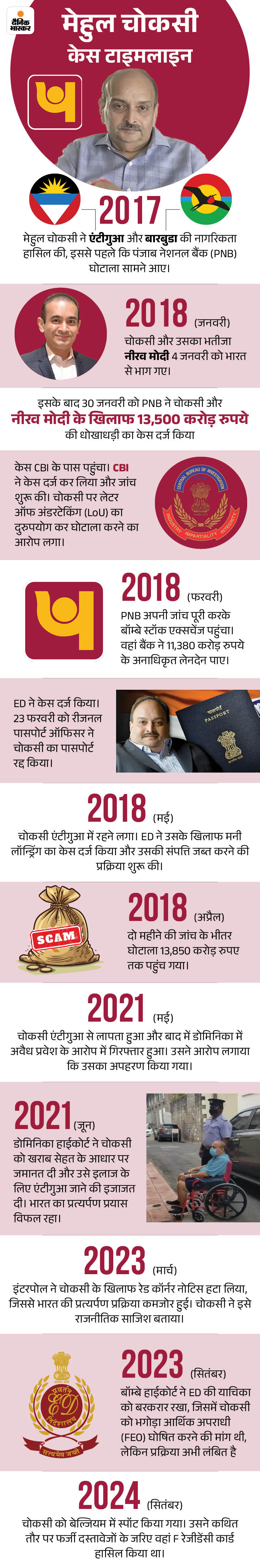 2018 में भारत छोड़ने से पहले ही चोकसी ने 2017 में ही एंटीगुआ-बारबूडा की नागरिकता ले ली थी। चोकसी बार-बार खराब सेहत का हवाला देकर भारत में पेशी पर आने से इनकार करता रहा। कभी-कभी वीडियो कॉन्फ्रेंसिंग के जरिए ही उसकी पेशी होती थी। भारत में उसकी कई संपत्तियां भी जब्त की जा चुकी हैं।