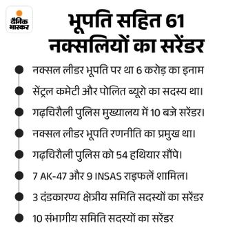 CG सरकार ने अकेले भूपति पर ही करीब 1 से डेढ़ करोड़ रुपए का इनाम रखा है। अन्य राज्यों को मिलाकर ये 6 करोड़ रुपए से ज्यादा का इनामी है। वहीं, एक दिन पहले सुकमा जिले में 50 लाख इनामी सहित 27 नक्सलियों ने सरेंडर किया है।