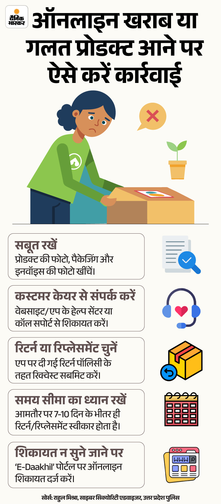 जवाब- ऐसी स्थिति में ग्राहक को सबसे पहले सबूत के तौर पर प्रोडक्ट की फोटो और वीडियो बनानी चाहिए। फिर शॉपिंग एप या वेबसाइट पर जाकर रिटर्न-रिप्लेसमेंट के लिए रिक्वेस्ट दर्ज करानी चाहिए। ज्यादातर कंपनियों के पास 7 से 10 दिन की रिटर्न पॉलिसी होती है।