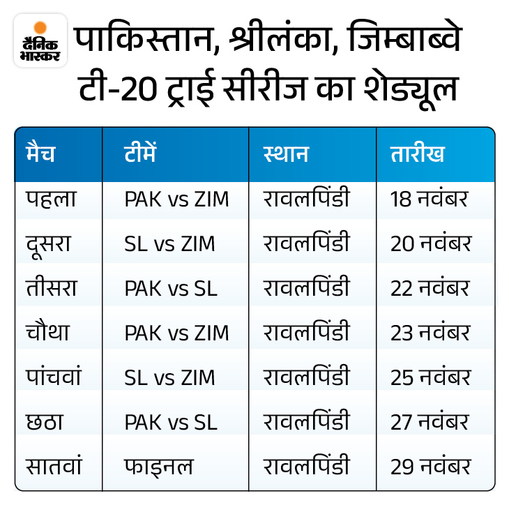 PCB ने ट्राई-सीरीज का शेड्यूल बदला था पाकिस्तान क्रिकेट बोर्ड (PCB) ने 13 नवंबर गुरुवार को श्रीलंका और जिम्बाब्वे के खिलाफ होने वाली टी20 ट्राई-सीरीज के शेड्यूल में बदलाव किया था। पहले यह सीरीज आज (17 नवंबर) से शुरू होनी थी। जोकि नए कार्यक्रम के अनुसार 18 नवंबर से शुरू होगी। इसका दूसरा मैच भी एक दिन बाद 20 नवंबर को खेला जाएगा।