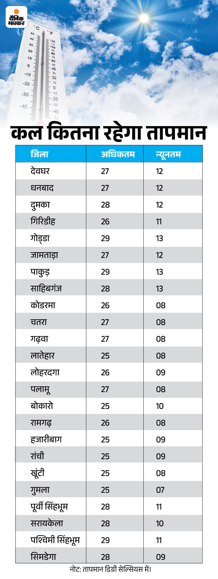 शनिवार को जिन जिलों में न्यूनतम तापमान 8-9 डिग्री सेल्सियस तक जा सकता है, उसमें कोडरमा, चतरा, गढ़वा, लातेहार, लोहरदगा, पलामू, रामगढ़, हजारीबाग, रांची, खूंटी और गुमला शामिल है।