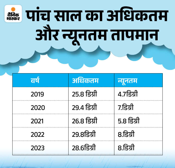 2020 में मात्र 0.9 एमएम, 2021 में 19.1 एमएम और 2022 में दिसंबर माह में बारिश नहीं हुई थी। इस माह बारिश हुई तो न्यूनतम तापमान काफी नीचे जा सकता है। हालांकि, जिस वर्ष नवंबर दिसंबर में बारिश नहीं होती है उस वर्ष न्यूनतम तापमान बहुत अधिक नीचे नहीं जाता है।