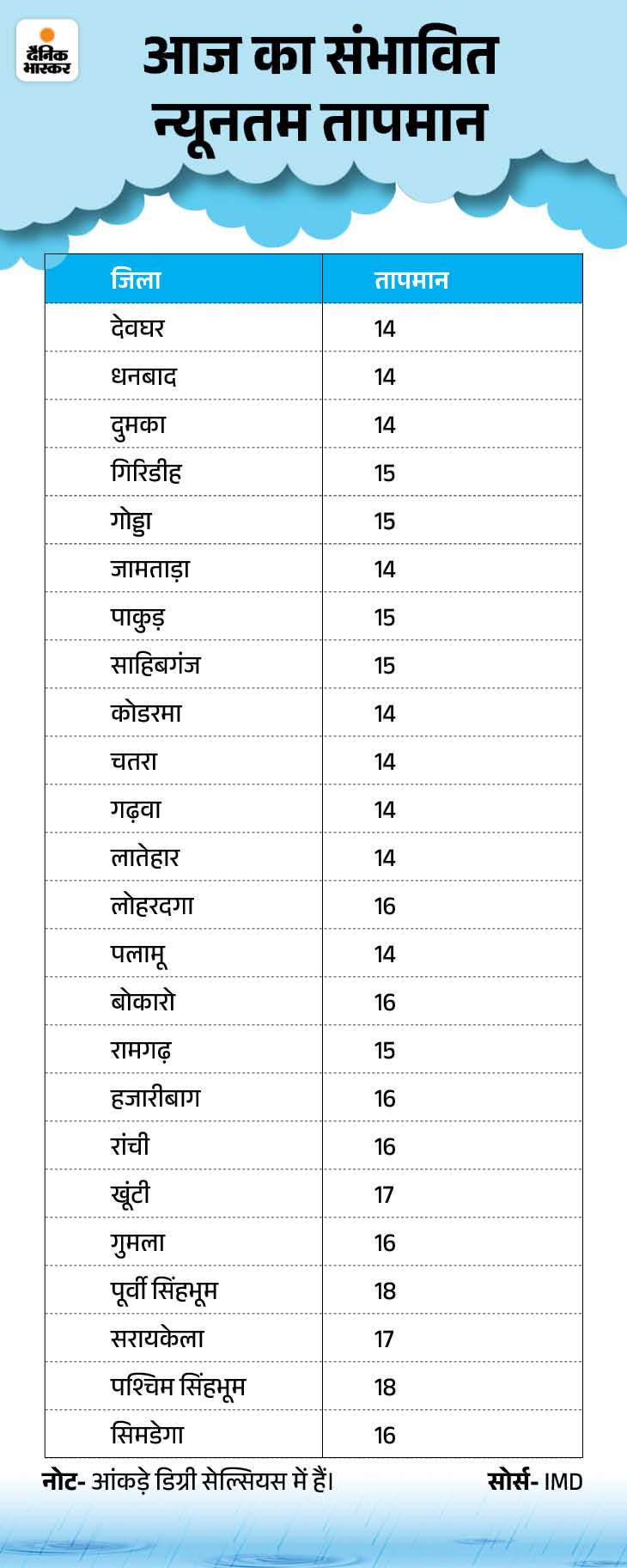 2022 में न्यूनतम तापमान 8.5 डिग्री और 2023 में 8 डिग्री तक गया था। लेकिन इस साल पांच साल का रिकॉर्ड टूट सकता है। रांची का न्यूनतम तापमान 5 डिग्री सेल्सियस तक और कांके का 3 डिग्री सेल्सियस तक जा सकता है।