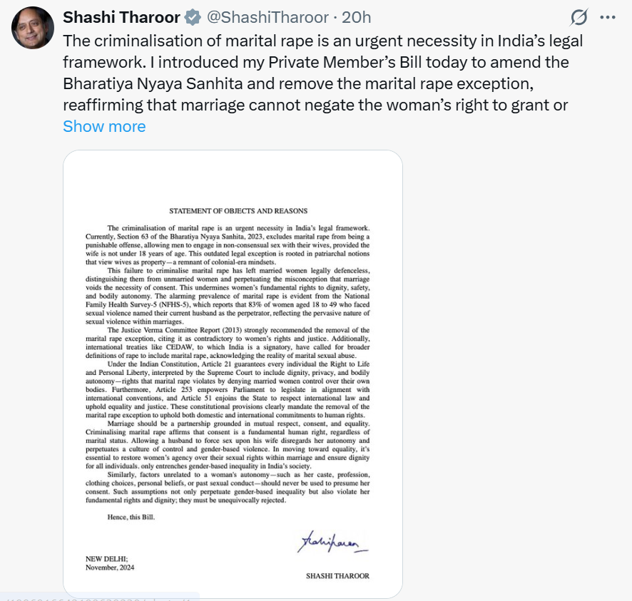 शशि थरूर ने X पर लिखा “नहीं का मतलब नहीं ही होता है। शादी किसी महिला की आजादी या उसकी नहीं सुरक्षा छीन सकती। जबरन यौन संबंध हिंसा है, चाहे रिश्ता कोई भी हो।” सहमति किसी महिला के कपड़ों, उसके पेशे, जाति, या पिछली किसी भी बात के आधार पर मान लेना न सिर्फ गलत है, बल्कि उसके बुनियादी अधिकारों का उल्लंघन भी है।