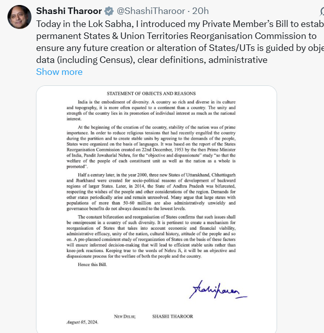 थरूर ने दूसरा बिल राज्यों और केंद्रशासित प्रदेशों के गठन और पुनर्गठन के लिए स्थायी आयोग बनाने को लेकर पेश किया। उन्होंने कहा कि भारत जैसे बड़े और विविध देश में नए राज्यों की मांगें और सीमाओं के विवाद समय-समय पर उठते रहते हैं। इसलिए फैसले किसी राजनीतिक दबाव से नहीं, बल्कि डेटा, जनसंख्या, प्रशासनिक क्षमता, सांस्कृतिक पहचान और स्थानीय लोगों की इच्छा जैसे मानकों के आधार पर होने चाहिए।