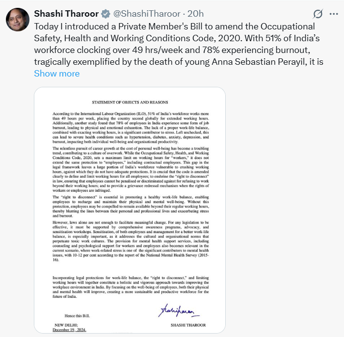 थरूर का तीसरा बिल कामकाजी लोगों की बढ़ती थकान और तनाव पर केंद्रित है। उन्होंने बताया कि देश में आधे से ज्यादा कर्मचारी हफ्ते में 49 घंटे से अधिक काम करते हैं, और ज्यादातर युवा प्रोफेशनल्स मानसिक थकावट और अत्यधिक काम का दबाव का सामना कर रहे हैं।