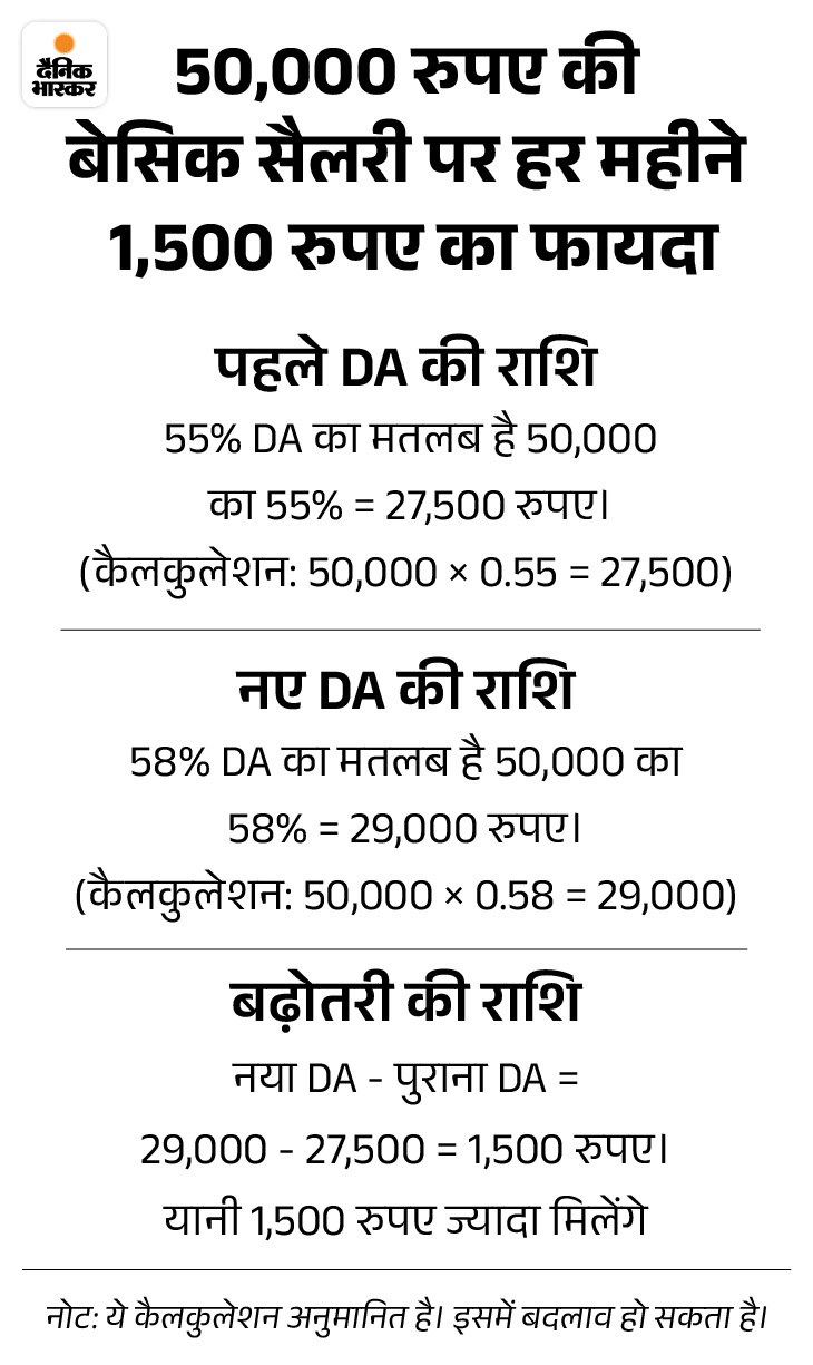 यह फैसला बुधवार को पीएम मोदी की अध्यक्षता में हुई कैबिनेट मीटिंग में लिया गया। अब कर्मचारियों का महंगाई भत्ता 55% से बढ़कर 58% हो जाएगा।