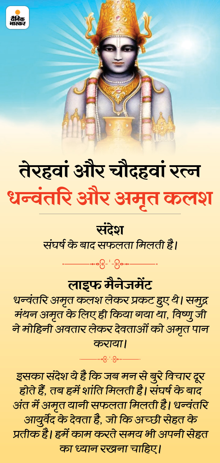 समुद्र मंथन के अंत में धन्वंतरि अमृत कलश लेकर प्रकट हुए थे। धन्वंतरि आयुर्वेद के भगवान हैं और अमृत अच्छी सेहत, लंबी उम्र का प्रतीक है। जब हम मन का मंथन करते हैं, तब बुरे विचार दूर होते हैं, मन शांत होता है। मन शांत रहता है तो हमारी सेहत अच्छी रहती है, हम अपने काम सही ढंग से कर पाते हैं, फिर धन और सुख-समृद्धि मिलती है।