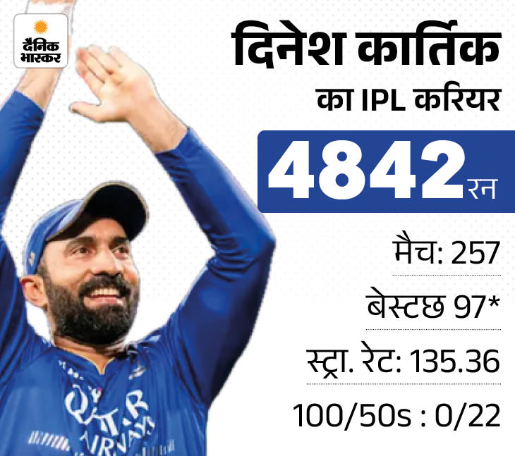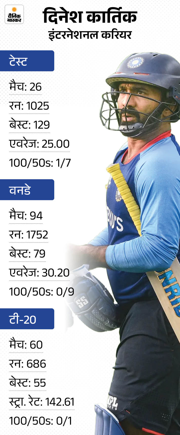 40 साल के कार्तिक इस समय दुबई में हैं। वे शारजाह वॉरियर्स से इंटरनेशनल लीग टी-20 खेल रहे हैं। उनकी टीम पहला मैच 39 रन से हार गई है। इसमें कार्तिक ने 20 बॉल पर 39 रन बनाए।
