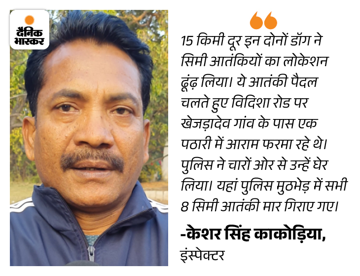 4. भोपाल जेल ब्रेक: फरार सिमी आतंकियों की लोकेशन तक ले गए एमपी पुलिस डॉग के इतिहास में सबसे बड़ी उपलब्धि के तौर पर भोपाल जेल ब्रेक कांड का खुलासा जुड़ा हुआ है। 23 वाहिनी में पदस्थ इंस्पेक्टर केशर सिंह काकोड़िया ने इस केस को याद करते हुए दैनिक भास्कर को बताया कि 30 अक्टूबर 2016 की रात डेढ़ बजे भोपाल सेंट्रल जेल से सिमी के 8 आतंकी एक जेल प्रहरी की हत्या कर फरार हो गए थे। आतंकियों ने जेल की 24 फीट दीवार लांघी थी।