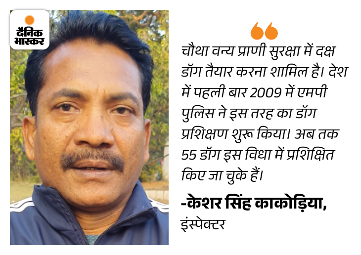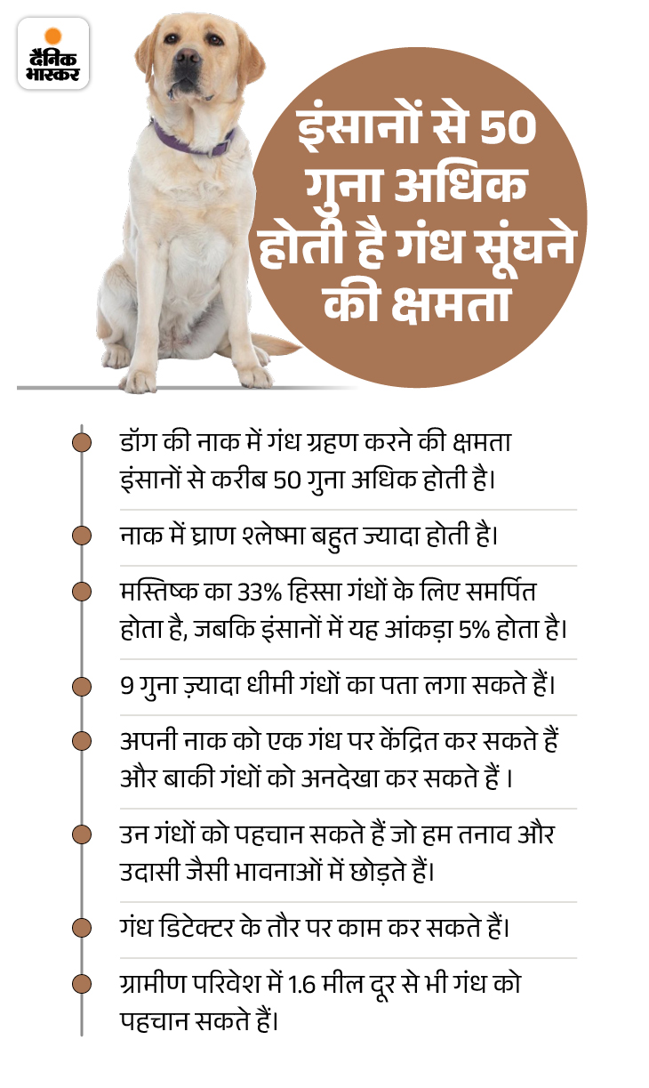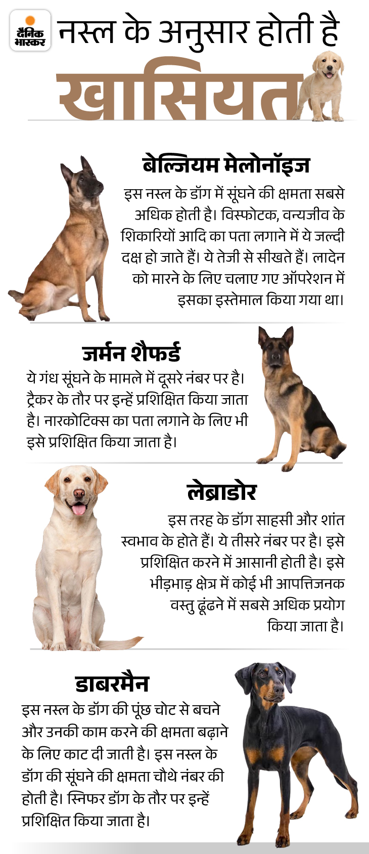 तीन चरण में किए जाते हैं ट्रेंड इंस्पेक्टर काकोड़िया के मुताबिक डॉग प्रशिक्षण का तीन चरण होता है। पहले चरण में डॉग को बुनियादी आदेश–निर्देश सिखाया जाता है। इसके बाद दूसरे चरण में नोज वर्क में ट्रेंड किया जाता है। इसमें डॉग को अलग–अलग गंध के आधार व्यक्ति या वस्तुओं की पहचान करना सिखाया जाता है।