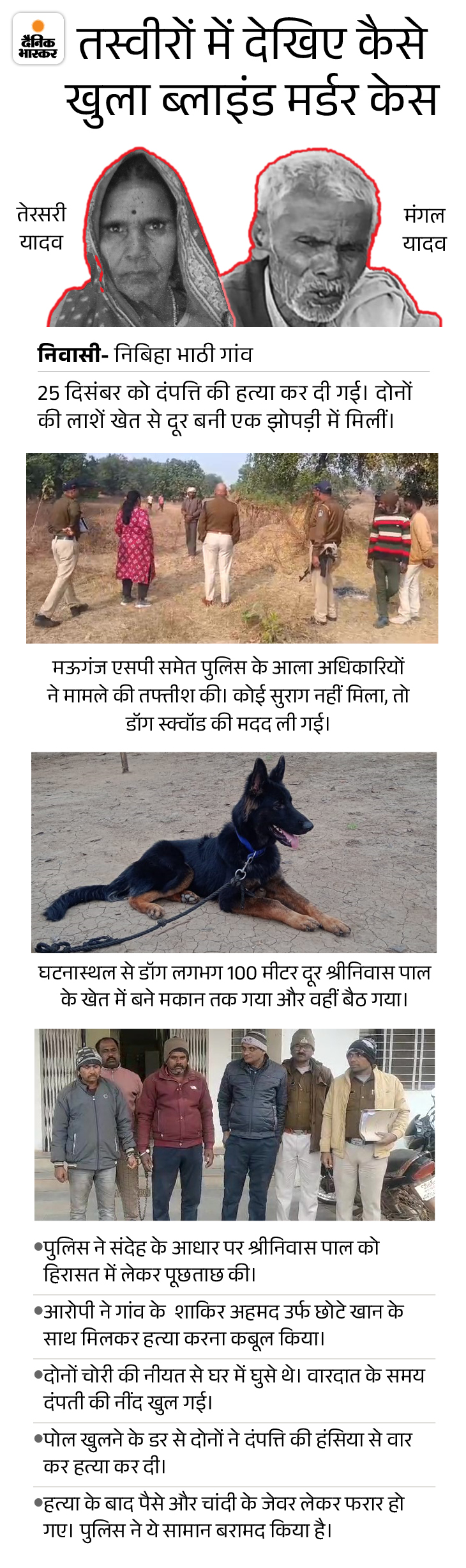 25 दिसंबर की देर रात मऊगंज जिले में एक बुजुर्ग दंपती की बेरहमी से हत्या कर दी गई। डबल मर्डर केस का कोई चश्मदीद नहीं था। ऐसे में पुलिस ने डॉग स्क्वॉड की मदद ली। खोजी डॉग घटनास्थल पर पहुंचा। कुछ देर बाद वो सीधे एक शख्स के पास जाकर बैठ गया, जो इस मामले