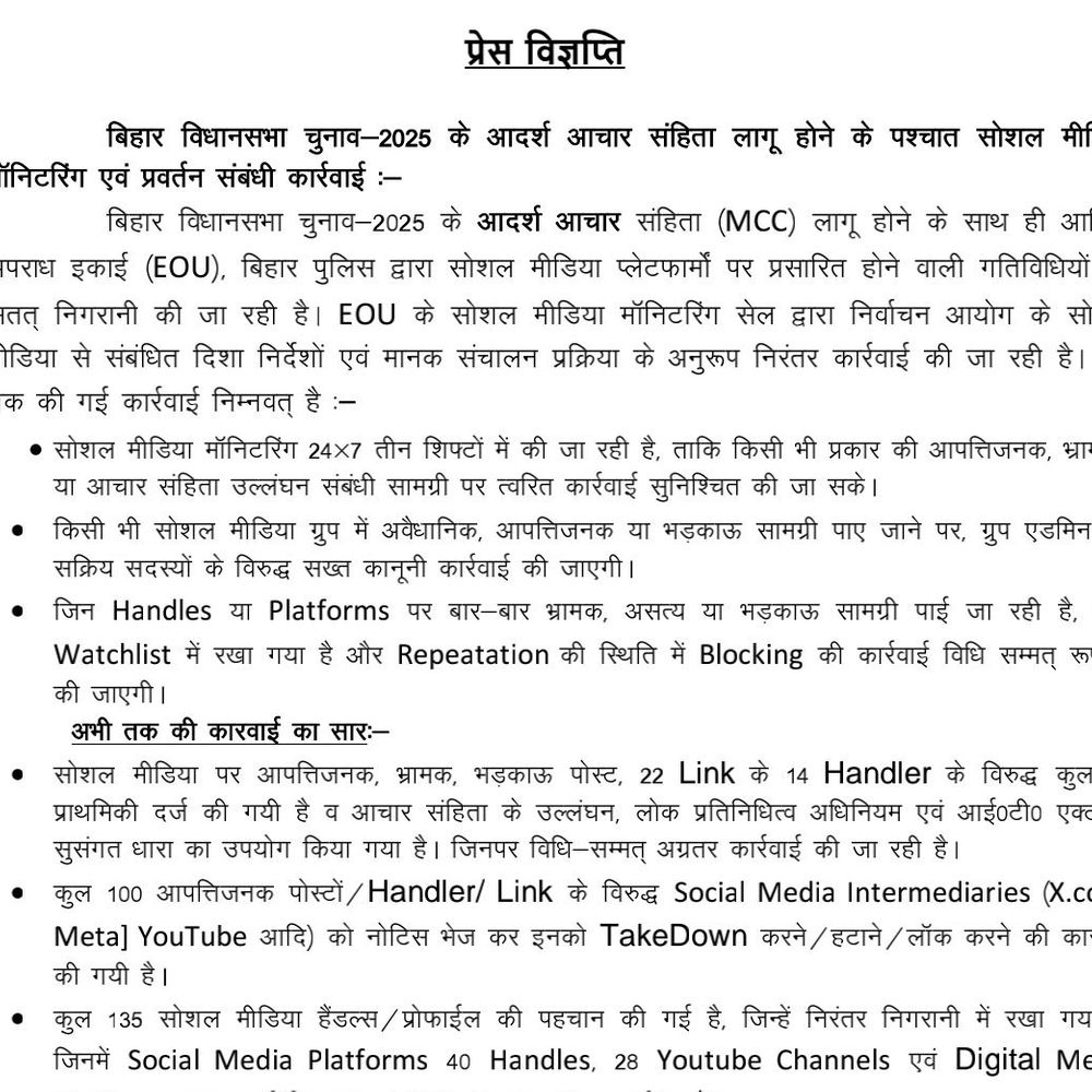 बिहार विधानसभा चुनाव-2025 के मद्देनजर आर्थिक अपराध इकाई (EOU) ने सोशल मीडिया पर अपनी निगरानी बढ़ा दी है। आदर्श आचार संहिता लागू होने के बाद से EOU ने अब तक 6 एफआईआर दर्ज की हैं, 100 से अधिक आपत्तिजनक लिंक हटाने के लिए नोटिस जारी किए हैं और 135 सोशल म