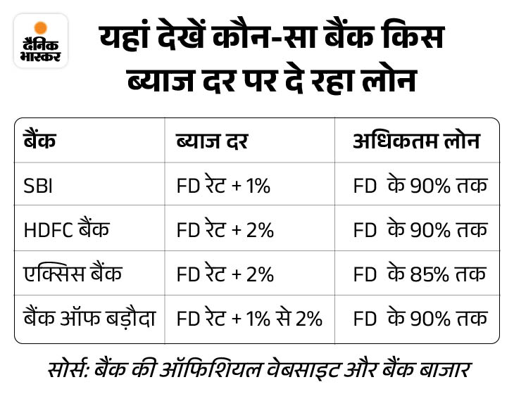 इसके तहत FD की वैल्यू का 90% तक आप लोन ले सकते हैं। मान लीजिए आपकी FD की कीमत 1 लाख रुपए है तो आपको 90 हजार रुपए लोन मिल सकता है। अगर आप FD पर लोन लेते हैं तो आपको फिक्स्ड डिपॉजिट पर मिलने वाले ब्याज से 1-2% ज्यादा ब्याज देना होगा। जैसे मान लीजिए की आपकी FD पर 4% ब्याज मिल रहा है तो आपको 5 से 6% ब्याज दर पर लोन मिल सकता है।