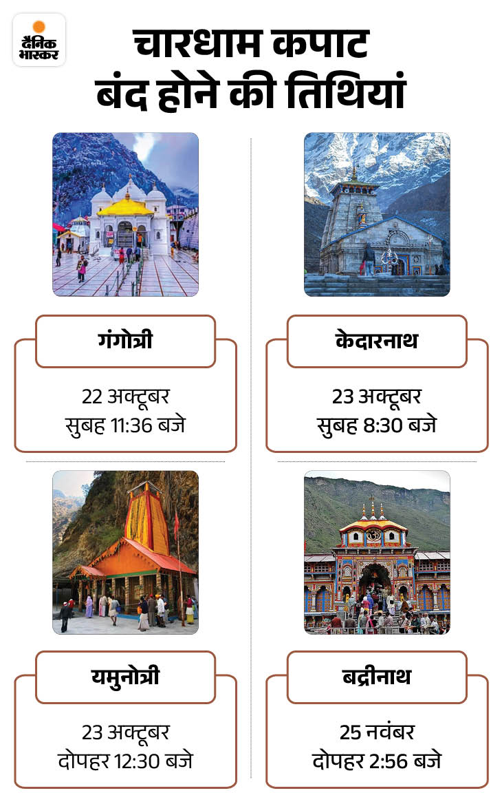 यमुनोत्री धाम के कपाट 23 अक्टूबर को भैयादूज के दिन दोपहर 12:30 बजे बंद होंगे। इसके साथ ही मां यमुना की उत्सव मूर्ति को पारंपरिक विधि-विधान से खरसाली गांव स्थित शीतकालीन मंदिर में लाया जाएगा। श्रद्धालु शीतकाल में खरसाली में मां यमुना के दर्शन-पूजन कर सकेंगे।