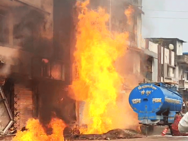 मां दो बच्चों के साथ किराना लेने निकली और आग की चपेट में आ गई।