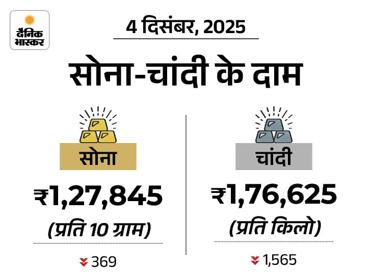 सोने-चांदी के दाम में 4 दिसंबर को गिरावट रही। इंडिया बुलियन एंड ज्वेलर्स एसोसिएशन (IBJA) के अनुसार 10 ग्राम सोना 369 रुपए सस्ता होकर 1,27,845 रुपए पर आ गया है। इससे पहले सोना 1,28,214 रुपए का था। वहीं, चांदी का दाम 1,565 रुपए गिरकर 1,76,625 रुपए हो गया है। इससे पहले चांदी की कीमत 1,78,190 रुपए प्रति किलोग्राम थी।