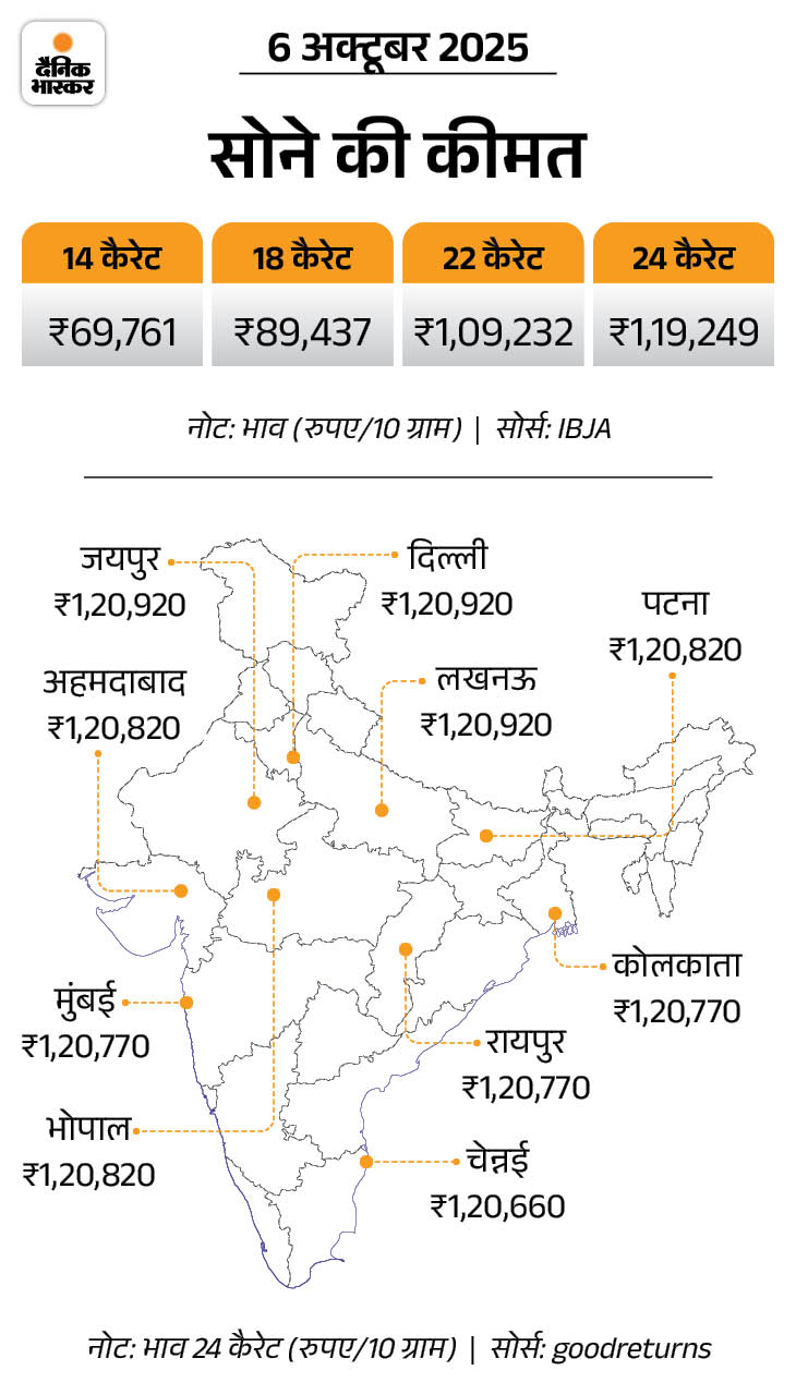 Gold Price Today (6 October 2025); Sona Chandi Ka Bhav Aaj Ka Kya Hai | Business News | 10 ग्राम सोना ₹1.19 लाख पार, ₹2295 महंगा हुआ: इस साल दाम ₹43,000 बढ़े; चांदी की कीमत ₹1.49 लाख प्रति किलो हुई