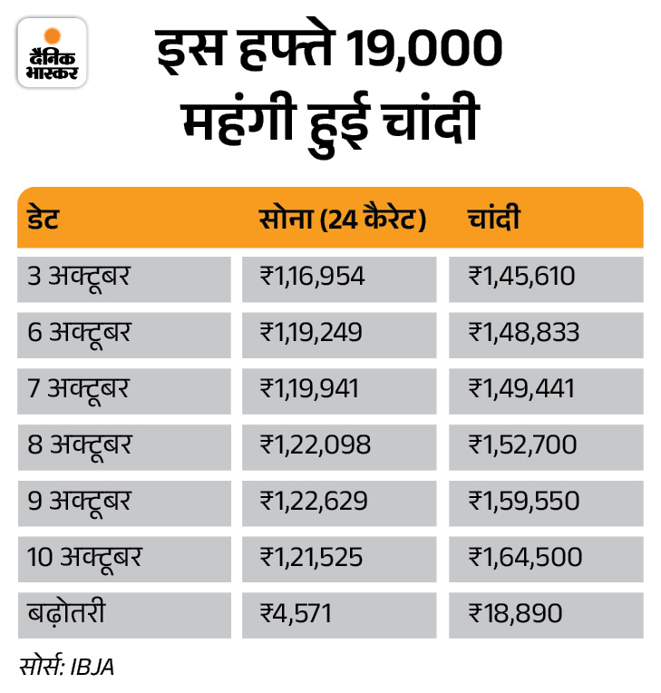 वहीं, चांदी की कीमत में इस दौरान और भी ज्यादा तेजी देखी गई। 3 अक्टूबर को चांदी का भाव ₹1,45,610 प्रति किलोग्राम था, जो 10 अक्टूबर तक 18,890 रुपए (12.90%) बढ़कर ₹1,64,500 तक पहुंच गया।
