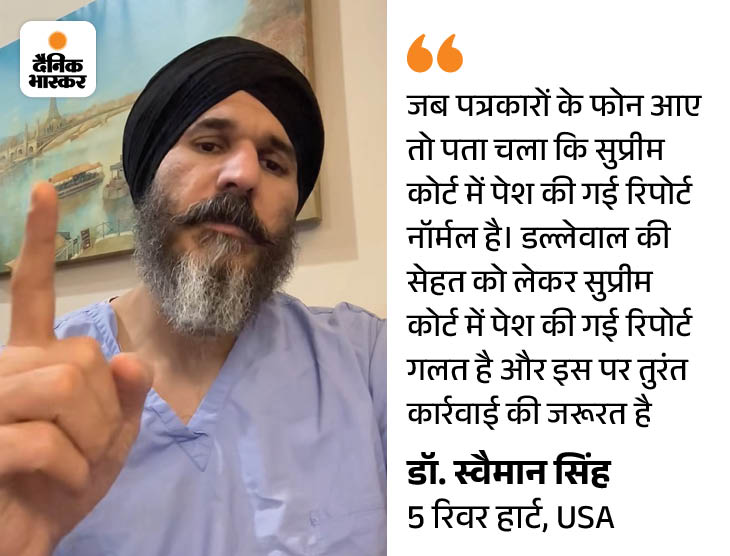 डल्लेवाल की सुप्रीम कोर्ट में पेश की रिपोर्ट पर विवाद सुप्रीम कोर्ट में पंजाब सरकार की तरफ से डल्लेवाल की पेश की गई मेडिकल रिपोर्ट पर बवाल हो गया है। पंजाबी मूल के अमेरिकी डॉक्टर स्वैमान सिंह ने रिपोर्ट पर सवाल उठाए हैं। उनसे जुड़ी टीम ही डल्लेवाल की देखरेख कर रही है।