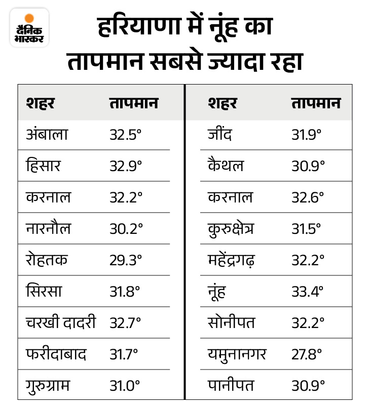 मौसम विभाग के अनुसार, गुरुग्राम और हिसार में न्यूनतम तापमान 15.7 डिग्री सेल्सियस रहा। वहीं नूंह में अधिकतम तापमान 33.4 डिग्री सेल्सियस रहा। यमुनानगर में अधिकतम तापमान 27.8 डिग्री सेल्सियस दर्ज किया गया, जो सामान्य से लगभग 6 डिग्री कम है।