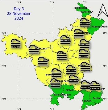 चौधरी चरण सिंह हरियाणा कृषि विश्वविद्यालय के कृषि मौसम विज्ञान विभाग के अध्यक्ष डॉ. मदन खिचड़ ने बताया कि हरियाणा राज्य में मौसम आमतौर पर खुश्क रहने की संभावना है। वातावरण में नमी की मात्रा बढ़ने से सुबह व रात को कहीं हल्की से मध्यम धुंध या कहीं स्मॉग की स्थिति बन सकती है।