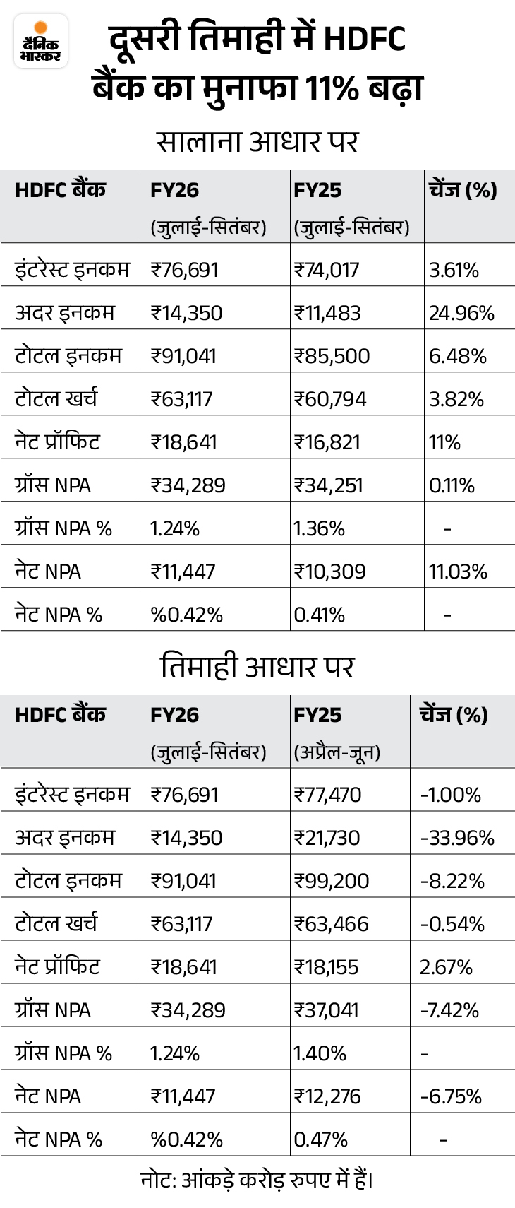 देश के सबसे बड़े प्राइवेट बैंक HDFC ने दूसरी तिमाही (जुलाई-सितंबर 2026) में कुल ₹91,041 करोड़ की कमाई की है। इस कमाई में से बैंक ने 63,117 करोड़ रुपए कर्मचारियों की सैलरी, बिजली बिल, डिपॉजिट जैसे कामों में खर्च किए।
