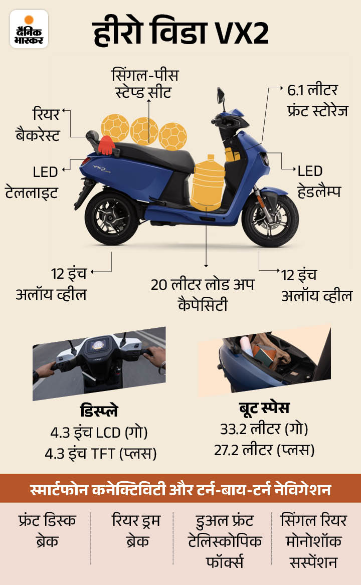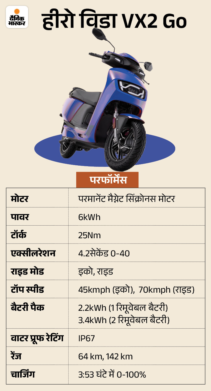 हीरो का कहना है कि VX2 को बैटरी रेंटल प्रोग्राम के साथ खरीदने पर आपको 96 पैसे/किलोमीटर चार्ज देना होगा। इसमें बैटरी का परफॉर्मेंस 70% कम हो जाता है तो, कंपनी इसे फ्री में बदलकर देगी। ये ई-स्कूटर TVS आईक्यूब, बजाज चेतक, ओला S1 और एथर रिज्टा को टक्कर देगा। इसकी डिलीवरी जल्द शुरू होने की उम्मीद है।