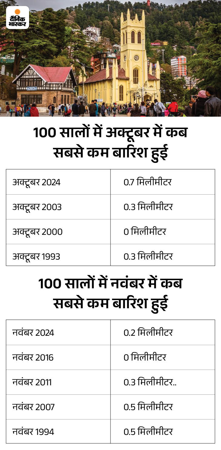 मौसम विज्ञानी शोभित कटियार ने बताया कि मानसून के बाद वेस्टर्न डिस्टरबेंस (WD) सक्रिय होने से ही हिमाचल में बारिश होती है। दो महीने में जो WD एक्टिव हुए है, वह कमजोर पड़े है और हिमाचल में बिन बरसे लेह-लद्दाख की ओर गए है।