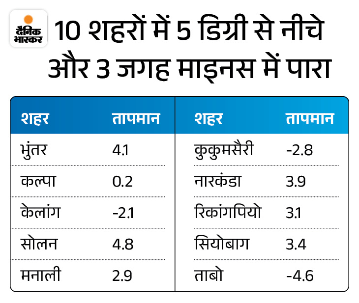 इसी तरह, राज्य के 10 शहरों में रात का पारा 5 डिग्री सेल्सियस से नीचे, 3 जगह माइनस में और 27 कस्बों का तापमान 10 डिग्री से नीचे लुढ़क गया है। इससे सुबह-शाम व रात को ठंड पड़ने लगी है। लाहौल स्पीति के केलांग का रात का तापमान माइनस (-2.1) डिग्री, कुकुमसैरी का माइनस (-2.8) और ताबो का माइनस -4.6 डिग्री तक गिर गया है।