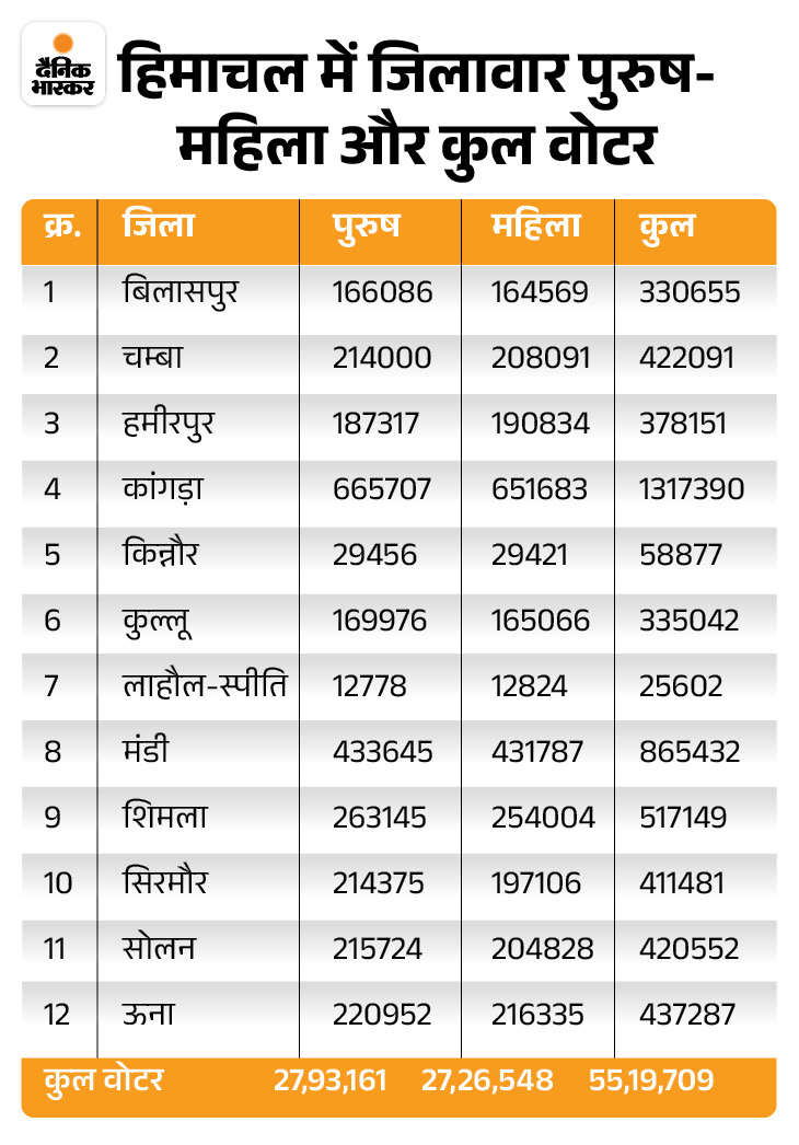 बेशक, जिलों के डीसी ने इलेक्ट्रॉल नोटिफाई नहीं किया। मगर वोटर लिस्ट फाइनल कर दी है। इसके मुताबिक, प्रदेश में इस बार 55 लाख 19 हजार 709 वोटर अपने मताधिकार का इस्तेमाल करेंगे। कांगड़ा जिला में सबसे ज्यादा 13 लाख 17 हजार 390 वोटर और लाहौल स्पीति में सबसे कम 25 हजार 602 मतदाता है।