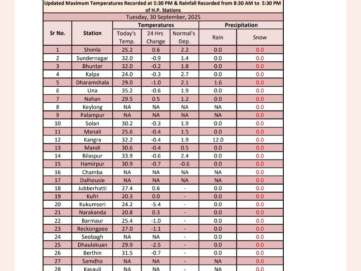 ऊना का तापमान सबसे ज्यादा 35.2 डिग्री सेल्सियस और शिमला का 25.2 डिग्री सेल्सियस हो गया है। प्रदेश के 13 शहरों में तापमान 30 डिग्री से अधिक चल रहा है। कल्पा, धर्मशाला और बिलासपुर के तापमान में सामान्य की तुलना में 3 डिग्री से ज्यादा का उछाल दर्ज किया गया है।प्रदेश के अधिकतर शहरों में न्यूनतम तापमान भी सामान्य से अधिक चल रहा है। 4 अक्टूबर से बारिश के बाद तापमान में हल्की गिरावट आ सकती है।