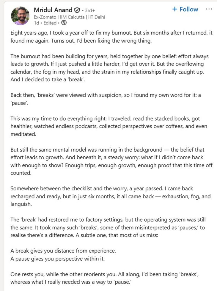लिंक्डइन पर एक पोस्ट पर मृदुल ने लिखा- मैं सालों से बर्नआउट का सामना कर रहा था, यह मानते हुए कि मेहनत हमेशा तरक्की लाती है, लेकिन काम से भरे हुए दिन, दिमाग में बोझ और रिश्तों में तनाव ने मुझे ‘ब्रेक’ लेने के लिए मजबूर किया। उस समय ‘ब्रेक’ को संदेह की नजर से देखा जाता था, इसलिए मैंने इसे ‘पॉज’ यानी विराम का नाम दिया।