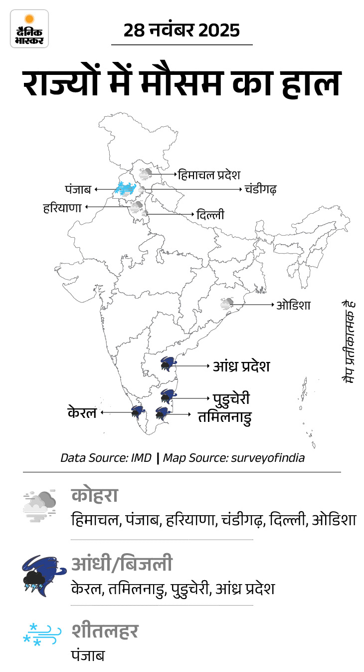 इधर बंगाल की खाड़ी में बने हल्के दबाव के कारण तमिलनाडु और केरल में बारिश की संभावना है। 28 और 29 नवंबर के लिए रेड अलर्ट जारी किया गया है।