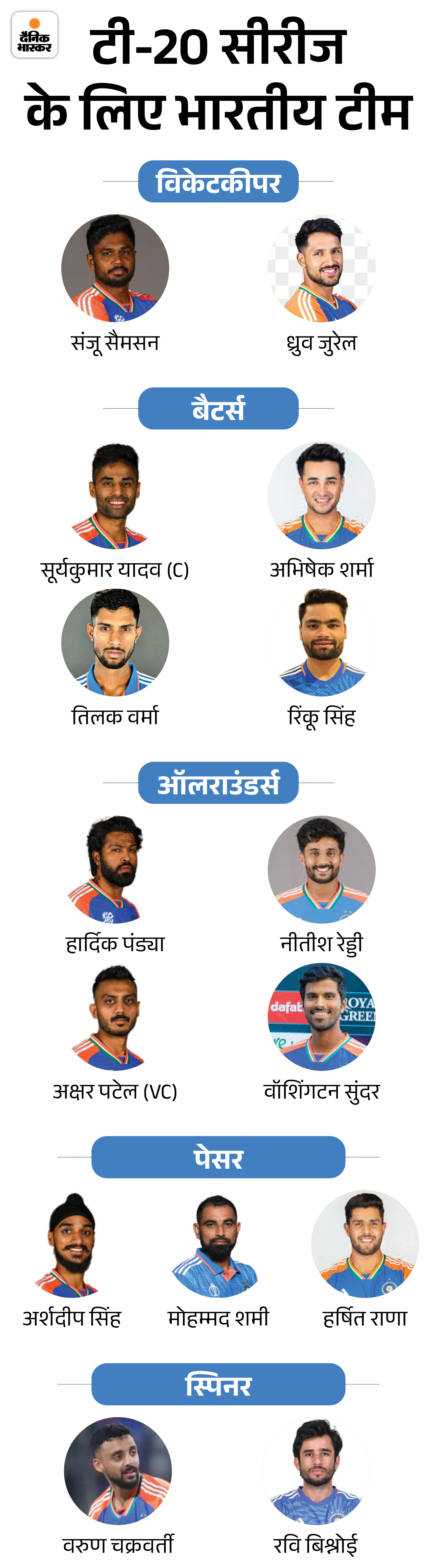 सूर्यकुमार यादव (कप्तान), अक्षर पटेल (उपकप्तान), संजू सैमसन, अभिषेक शर्मा, तिलक वर्मा, हार्दिक पंड्या, रिंकू सिंह, नीतीश रेड्डी, हर्षित राणा, अर्शदीप सिंह, मोहम्मद शमी, ध्रुव जुरेल (विकेटकीपर), रवि बिश्नोई, वरुण चक्रवर्ती और वॉशिंगटन सुंदर।