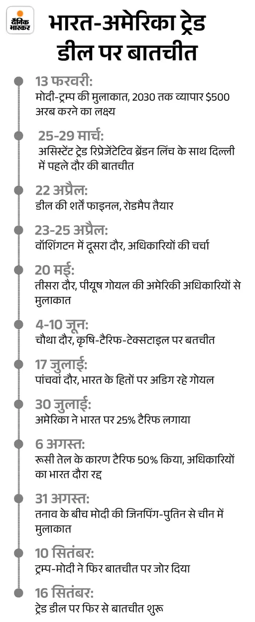 जवाब: भारत और अमेरिका लंबे समय से एक ट्रेड डील पर काम कर रहे हैं। 25 अगस्त को अमेरिकी टीम छठे दौर की बातचीत के लिए आने वाली थी, लेकिन बाद में इसे टाल दिया गया। एग्रीकल्च सेक्टर जैसे मुद्दों पर सहमति नहीं बन पा रही थी।