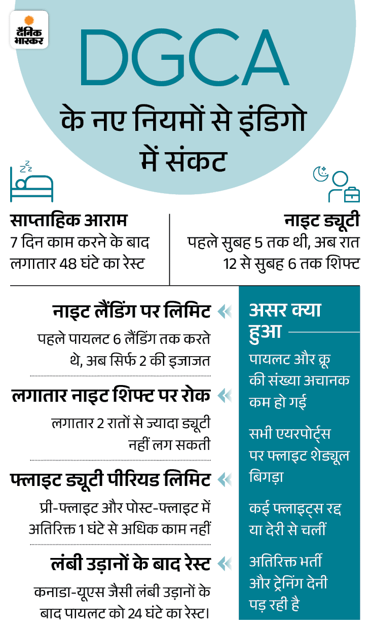 DGCA ने 1 नवंबर से पायलटों और अन्य क्रू मेंबर्स के काम से जुड़े नियमों में बदलाव किए हैं। इसे फ्लाइट ड्यूटी टाइम लिमिटेशन (FDTL) नाम दिया गया है। इन्हें दो चरणों में लागू किया गया। पहला चरण 1 जुलाई को लागू हुआ।
