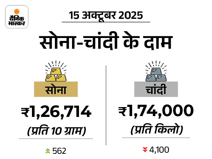 आज सोने के दाम में तेजी और चांदी में गिरावट है। इंडिया बुलियन एंड ज्वेलर्स एसोसिएशन (IBJA) के अनुसार, 10 ग्राम 24 कैरेट सोने के दाम 562 रुपए बढ़कर ₹1,26,714 के ऑलटाइम हाई पर पहुंच गया है। कल ये 1,26,152 रुपए पर था। इस महीने के पहले 15 दिन में सोना 10,000 रुपए से ज्यादा महंगा हुआ है, यानी रोजाना औसत 700 रुपए बढ़ा है।