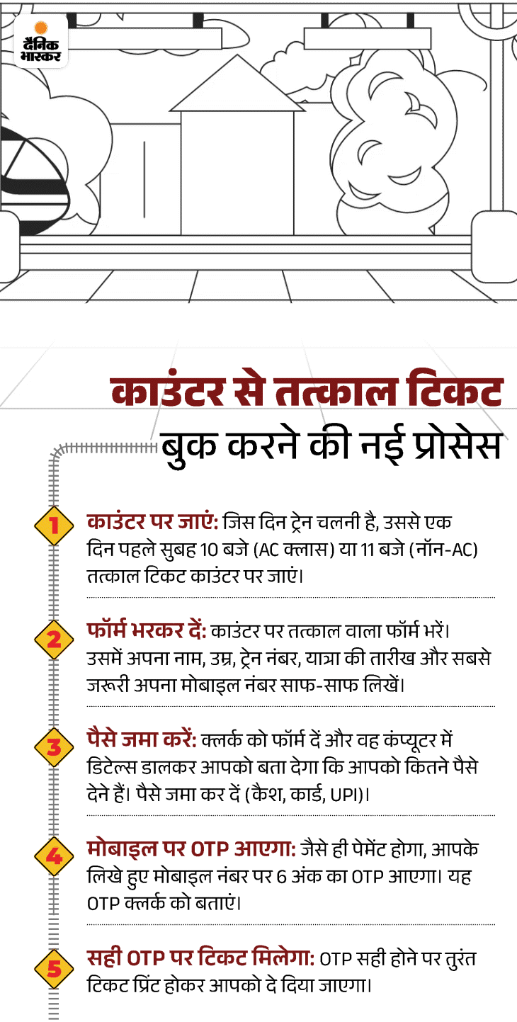 तत्काल टिकट हाई डिमांड वाले होते हैं, इस वजह से काउंटर पर लंबी लाइन लगती है। अब जब कोई पैसेंजर काउंटर पर टिकट बुक करेगा, तो उसके मोबाइल नंबर पर OTP भेजा जाएगा। OTP डालने के बाद ही टिकट कन्फर्म होगा। इससे फर्जी बुकिंग रुकेगी और असली यात्रियों को फायदा मिलेगा।