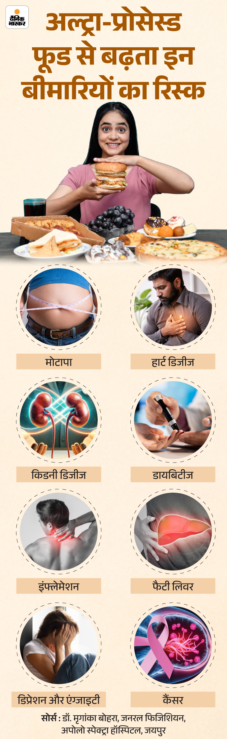 पिछले साल ICMR और NIN ने साफ कहा था कि UPF में फाइबर और पोषक तत्व में कम, लेकिन शुगर, नमक और तेल में अत्यधिक होते हैं। इनका स्वाद ऐसा होता है कि ये जल्दी लत लगा देते हैं और इनकी उपलब्धता पूरे देश में इतनी आसान है कि लोग इन्हें रोजमर्रा के खाने में शामिल करने लगे हैं। इकॉनोमिक सर्वे ने भी बताया कि भारत के 56% से ज्यादा रोगों की जड़ अस्वास्थ्यकर भोजन है, जिसमें जंक फूड मुख्य भूमिका निभा रहा है।