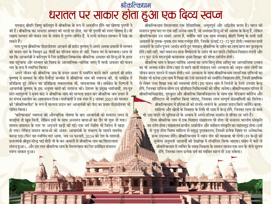 राष्ट्रपति-प्रधानमंत्री समेत तमाम VVIP को न्योता कथा का न्योता यूपी के सीएम योगी, राष्ट्रपति द्रौपदी मुर्मू, प्रधानमंत्री नरेंद्र मोदी, गृहमंत्री अमित शाह और रक्षामंत्री राजनाथ सिंह के अलावा उत्तराखंड, दिल्ली समेत कई प्रदेशों के राज्यपालों-मंत्रियों को भी भेजा गया है। पीएम मोदी ने 19 फरवरी को संभल में कल्कि धाम मंदिर का शिलान्यास किया था। कल्कि को भगवान विष्णु का अंतिम अवतार माना जाता है, जो कलियुग के अंत में यानी 4 लाख 26 हजार साल बाद आएंगे।